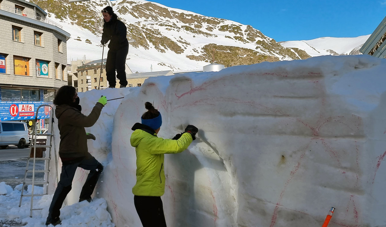 Tres artistes andorrans comencen a modelar una gran escultura de neu al Pas de la Casa