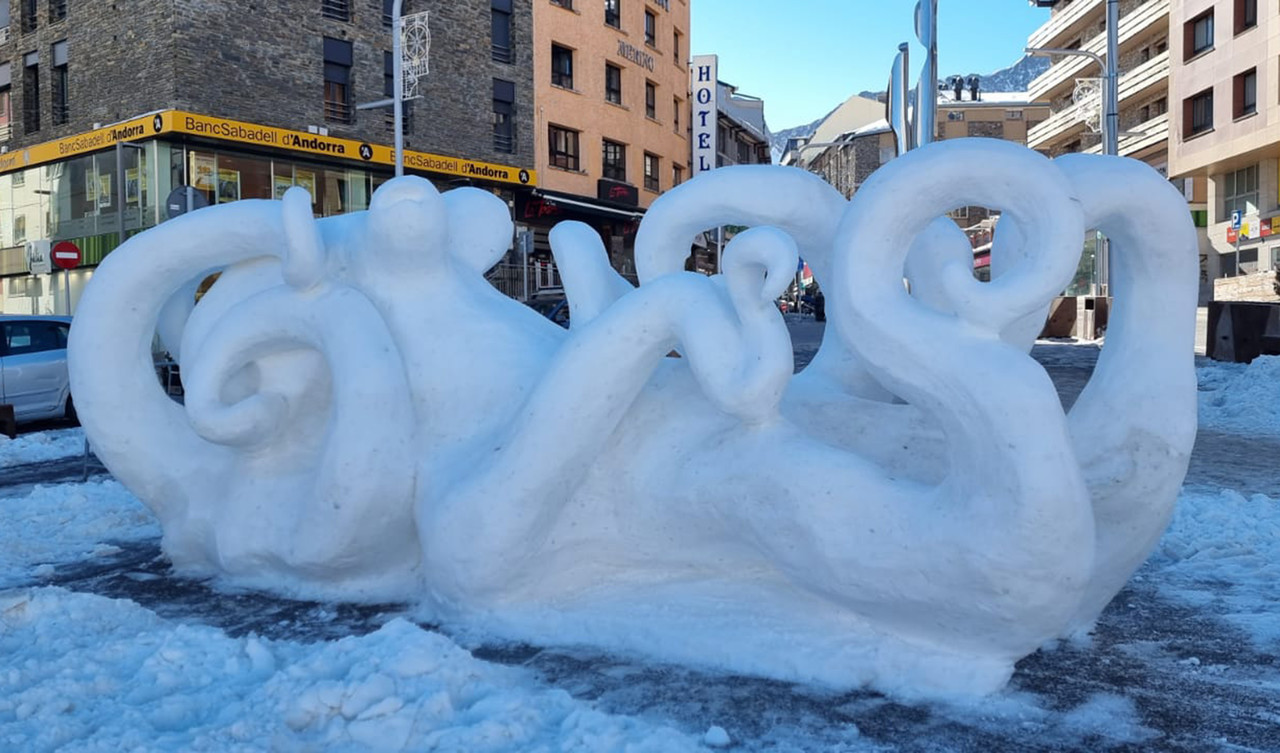 L’escultura d’un pop gegant de neu ja llueix al Pas de la Casa