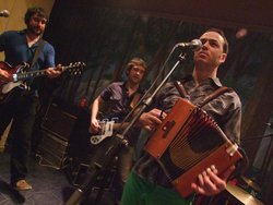 - Belda, l’acordió diatònic i dos dels seus badocs: el guitarrista Marc Serrats (Dijous Paella) i Lo Mante (Terra Ferma). Foto: EL PERIÒDIC