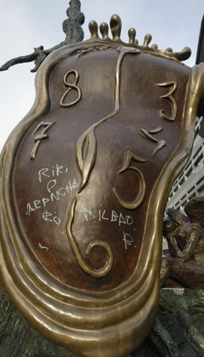 El dubtós mèrit dels pioners, o la medalla d’honor a la parella de cellajunts més daliniana del país, se l’han adjudicat des d’ara i per sempre més un tal Riki i una tal Arancha, bilbaïns per a més senyes, que han estampat la seva firma més aviat àgrafa a l’esfera de Noblesse du temps, el monumental rellotge de bronze de l’artista empordanès que des de l’agost del 2010 senyoreja la Rotonda de la capital. La pintada –la tenen aquí al costat, just entre el segon i el tercer quart– va aparèixer ahir i ràpidament se’n van fer ressò les xarxes socials. La bona notícia és que es tracta de la primera (diguem-ne) agressió que pateix l’escultura, però posa de manifest que les baranes amb què es va protegir l’obra per evitar que els turistes s’hi enfilessin o seguessin al peu del monument són clarament insuficients. De fet, ja aleshores es va anunciar la instal·lació d’un sistema de vigilància a través de videocàmeres que finalment va quedar al sarró de les bones intencions.