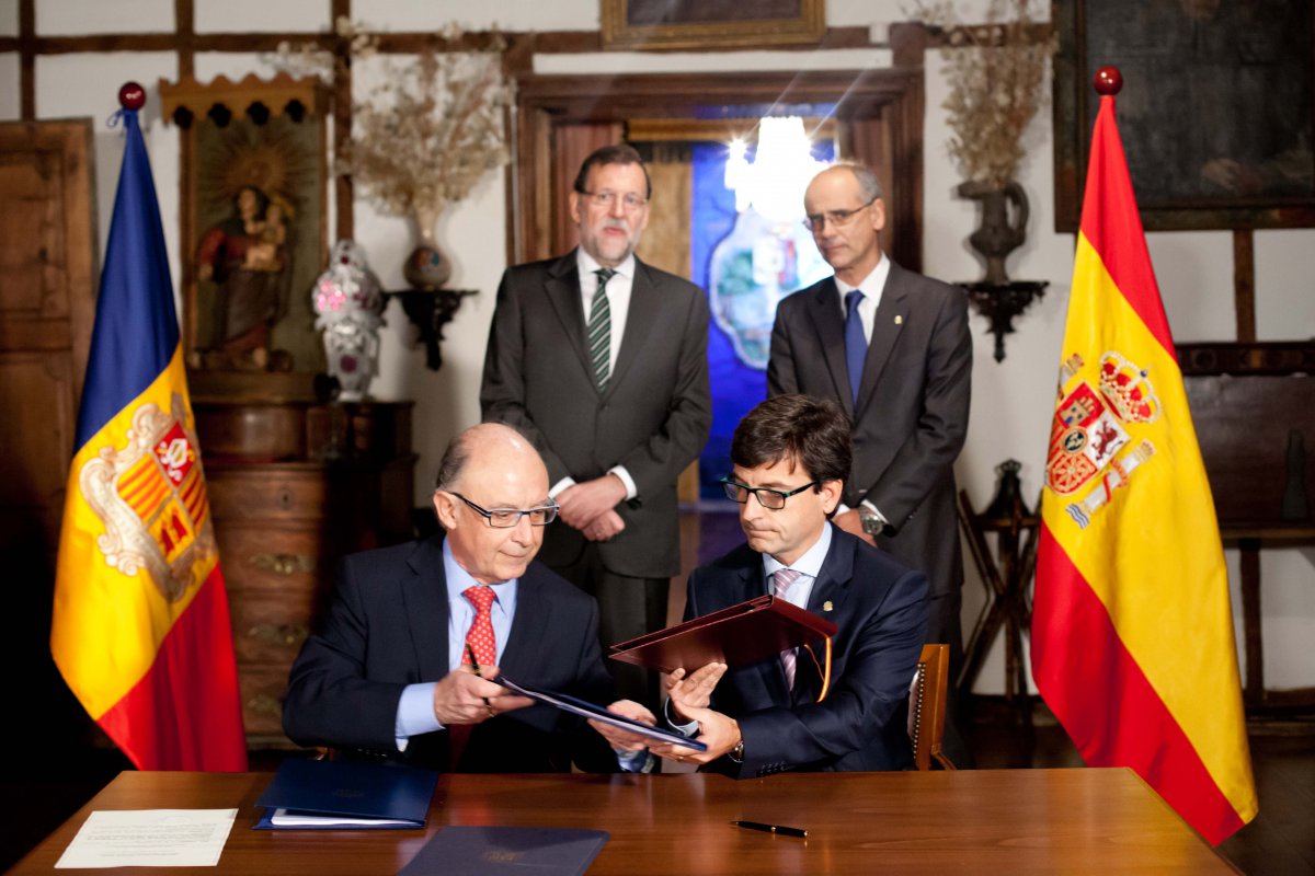 VISITA DE MONTORO I RAJOY / El ministre d’Hisenda espanyol, Cristóbal Montoro, i el ministre de Finances andorrà, Jordi Cinca, van firmar el gener de l’any passat el conveni per evitar la doble imposició entre Andorra i Espanya, amb la presència del president espanyol, Mariano Rajoy, i el cap de Govern andorrà, Toni Martí.