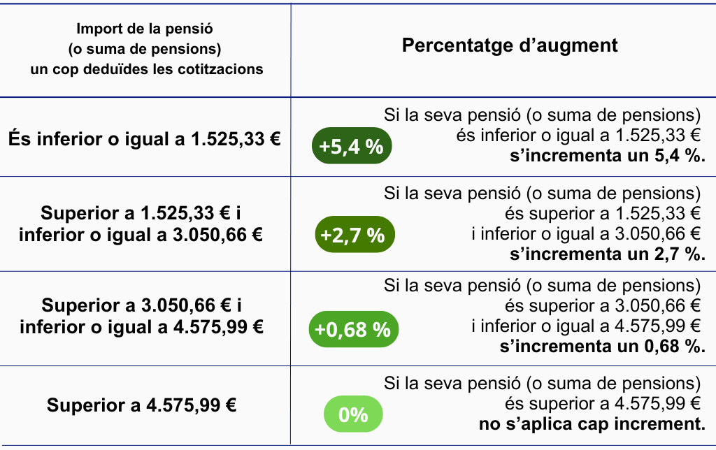 L’augment s’aplica en funció de l’import de la pensió (o de la suma de pensions) una vegada deduïdes les cotitzacions, i estableix diferents trams d’actualització. Així, les pensions inferiors o iguals a 1.525,33 euros s’incrementen un 5,4%; en el cas de les pensions superiors a 1.525,33 euros i inferiors o iguals a 3.050,66 euros, l’augment és del 2,7%, mentre que les superiors a 3.050,66 euros i inferiors o iguals a 4.575,99 euros s’actualitzen en un 0,68%. Cal remarcar, però, que les pensions que superen els 4.575,99 euros no experimenten cap increment.