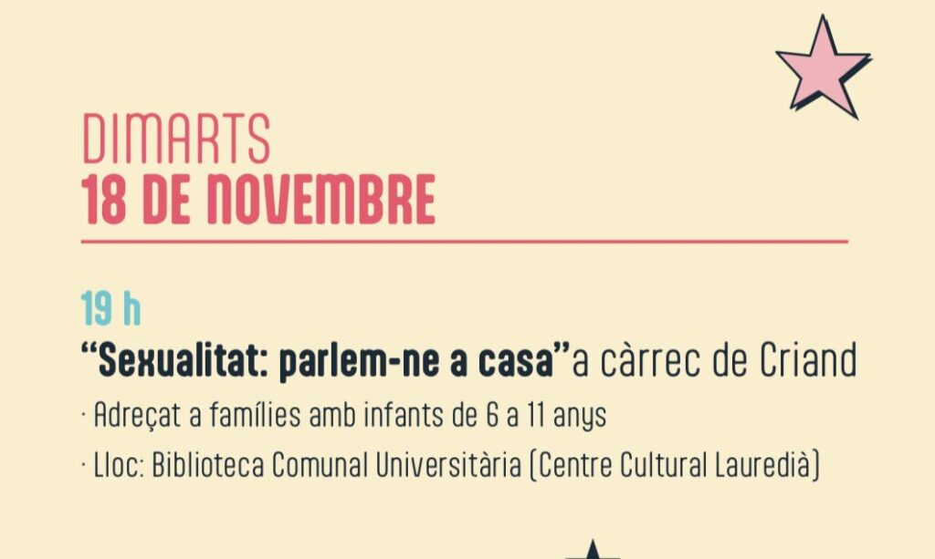 És una xerrada adreçada sobretot a les famílies, perquè moltes vegades no saben com abordar aquest tema. No saben si cal parlar-ne des de casa, si ja es tracta a les escoles o si es fa des del programa de consulta jove de salut. Tot queda una mica a l’aire, però és veritat que aquí hi intervenen tres àmbits principals: l’educació, la salut i la família. L’educació sexual ens acompanya des del naixement fins que morim, i les famílies també hi tenen un paper fonamental. Cal donar-los protagonisme.