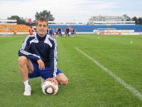 - Quim Salvat, que debuta, abans de l’entrenament. A la galeria, Maneiro i Juli Sánchez, a la sessió a l’estadi Pasienky, ahir. Foto: R. M. S.