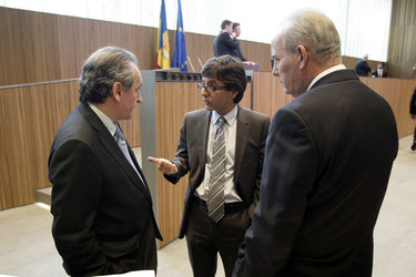 - Bartumeu, Cinca i Aleix conversen, ahir, abans de donar inici a la sessió de control del Consell General Foto: TONY LARA