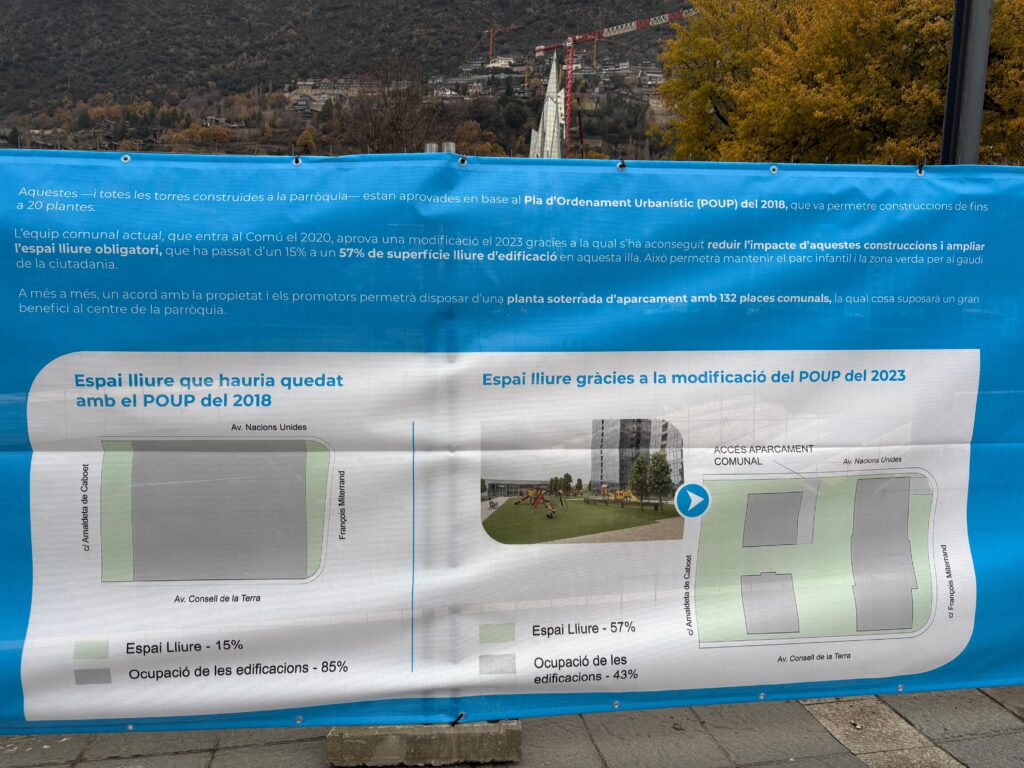 Els panells indiquen que tant la nova edificació com les torres ja aixecades deriven del Pla d’Ordenament Urbanístic Parroquial (POUP) del 2018, el qual permetia edificacions de fins a 20 plantes. El comú subratlla que, en assumir el mandat el 2020, va impulsar una revisió del planejament per “reduir l’impacte” d’aquests projectes heretats, i que aquesta modificació va elevar l’espai lliure obligatori del 15% al 57% dins de la mateixa illa urbana.