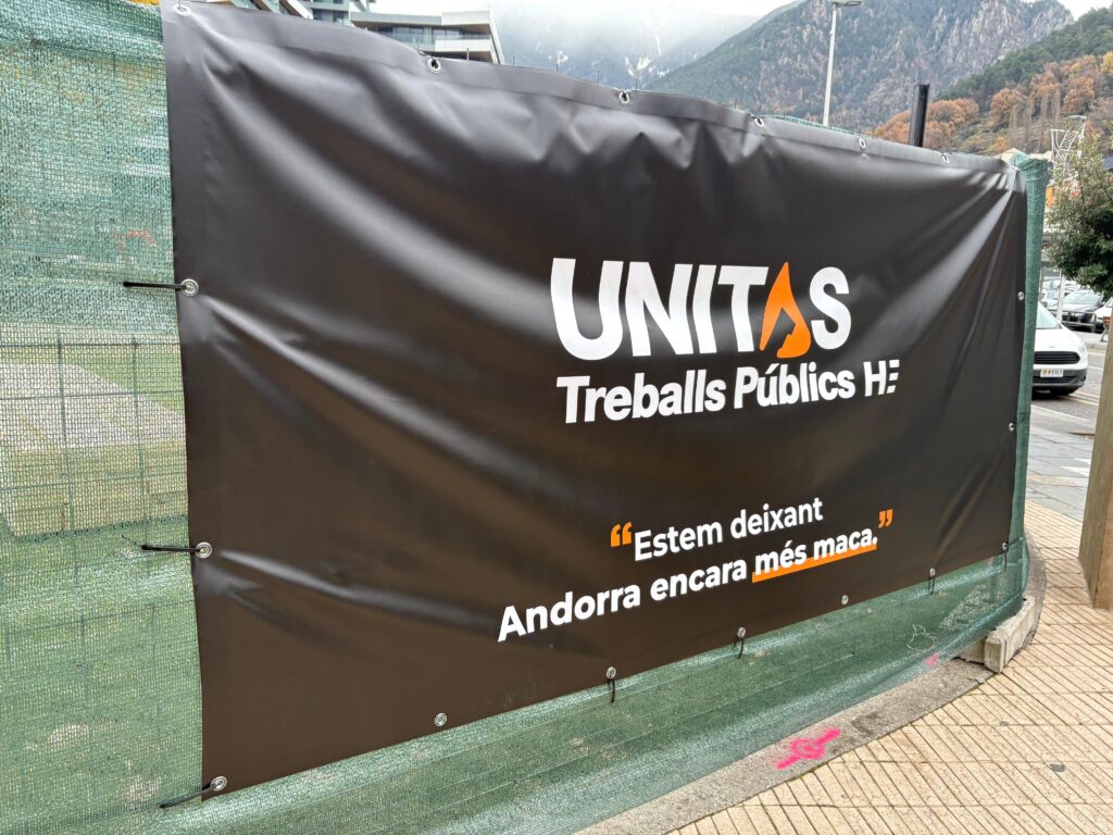 Així, en un dels extrems del perímetre, un cartell de l’empresa d’obres exhibeix el lema ‘Estem deixant Andorra encara més maca’, mentre al darrere s’estén la zona de treball amb maquinària, materials, tanques verdes i una gran estructura coberta amb lona. Les imatges del terreny mostren el parc infantil i l’espai de sorral buits i delimitats, amb fustes, cables i vehicles de treball acumulats al voltant. Així doncs, amb aquesta campanya visual, el comú pretén reafirmar que la modificació urbanística del 2023 redueix l’impacte del projecte i preserva més espai públic que el planejament original, en un moment en què el tancament del parc és percebut com una pèrdua temporal d’un dels espais més utilitzats del barri.