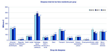 menjar dormir i moure’s / Els grups de consum que concentren la major part de la despesa familiar, són l’alimentació, l’habitatge i el transport amb el 56,5% de la totalitat. No obstant això, si la despesa en alimentació va augmentar un 13% i 24 milions d’euros més que el 2011, la despesa en habitatge, electricitat i calefacció va retrocedir un 11,2% amb una contracció de la despesa xifrada en 54 milions d’euros. I el transport també va baixar un 1,8%. Les llars també van contenir la despesa en hotels, cafès i restaurants (–15.7% amb 22 milions d’euros d’estalvi). En canvi, el consum en salut va augmentar un 32% amb 26 milions d’euros més de despesa respecte el 2011. Les famílies també van gastar sis milions d’euros més en mobles, estris i serveis per a la llar (14%). Aquesta última xifra s’equipara al sis milions que les famílies es van gastar de més en begudes alcohòliques i tabac cosa que aboca un increment escandalós del 41,3%.