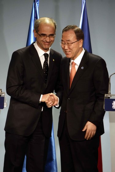 - Encaixada de mans entre Martí i Ban Ki-moon. A dalt, el Secretari General de l’ONU en la roda de premsa. A baix, amb els síndics Mateu i Bonell Foto: TONY LARA