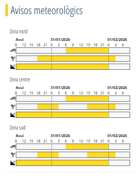 El Servei Meteorològic també ha emès un avís groc per vent a partir de dissabte al matí. Es preveuen ratxes intenses que es mantindran al llarg de tota la jornada de dissabte, fet que pot complicar la mobilitat i les activitats a l’aire lliure, especialment a les cotes altes.