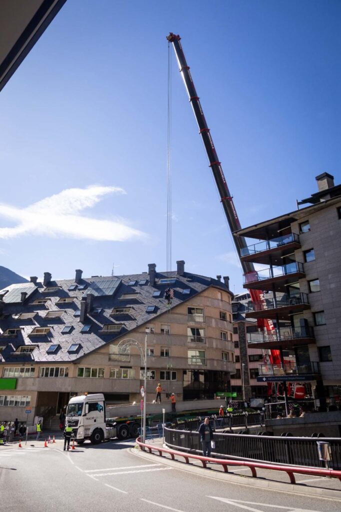 FEDA Ecoterm ha iniciat aquest dilluns la instal·lació de les bigues per ampliar la central de fred d’Escaldes-Engordany. Segons han informat, la plataforma, que es construirà sobre el Valira d’Orient, “permetrà incrementar la capacitat de producció i distribució de fred de la xarxa”. En aquest sentit, per instal·lar les bigues, s’ha ubicat al carrer Josep Viladomat una grua de grans dimensions (400 tones) que impedeix circular per aquell tram i, a més, també se n’ha baixat una altra de 60 tones a la llera del riu per fer la instal·lació.
