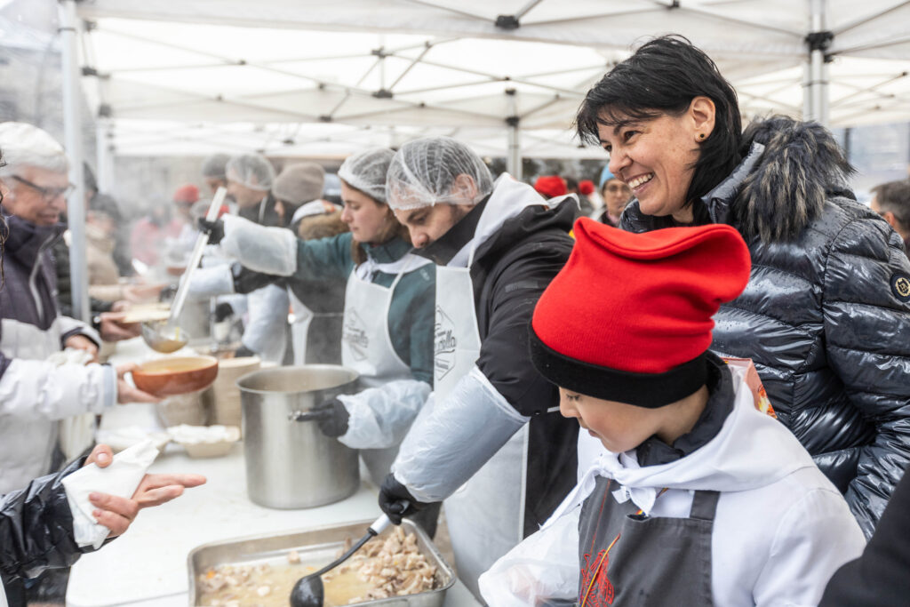 Malgrat la pluja, el públic ha respost de manera massiva i ha fet cua a la plaça. El repartiment s’ha organitzat amb cinc punts de servei per agilitzar l’atenció, mentre que les taules per al dinar popular s’han instal·lat al pati cobert de l’escola francesa, adjacent a la plaça, per garantir el confort dels assistents.