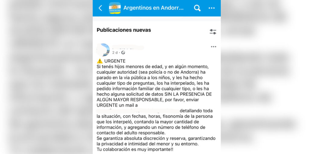 L’alerta es va activar quan l’associació ‘Argentinos en Andorra’ va difondre un missatge “urgent” el passat 14 de gener a les xarxes socials. En la publicació, l’entitat demanava a les famílies que escrivissin un correu a la mateixa associació si “alguna autoritat (sigui Policia o no d’Andorra) ha aturat a la via pública als nens i els hi ha fet qualsevol tipus de pregunta”, posant especial èmfasi en si aquestes preguntes s’havien fet “sense cap adult responsable” al costat del menor.