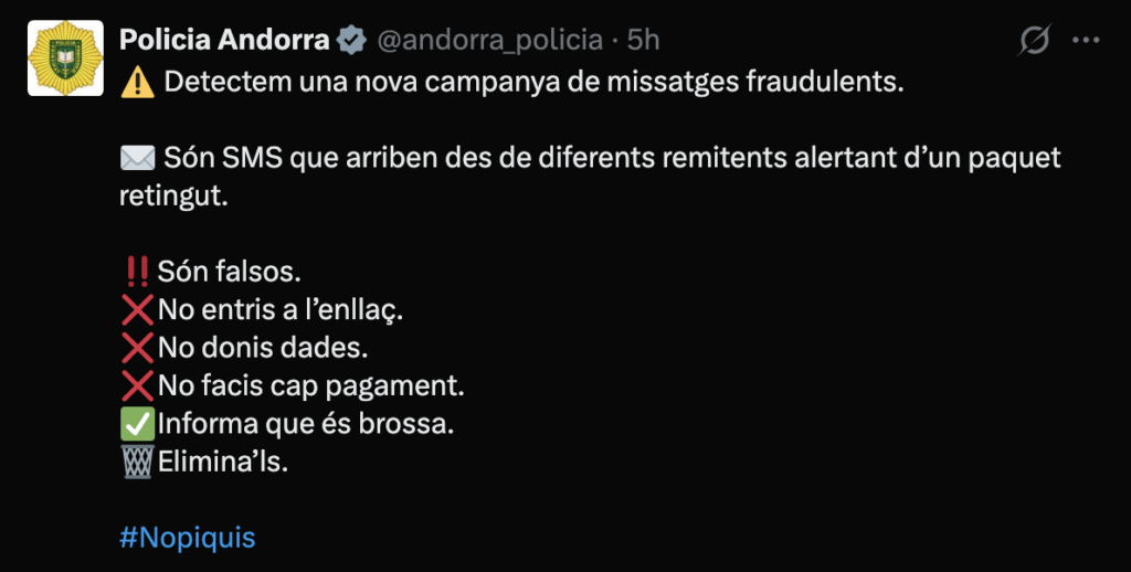 La Policia ha advertit d’una nova campanya de frau que s’està difonent a través de missatges SMS entre la població. Segons han comunicat a les seves xarxes socials, es tracta de missatges enganyosos que simulen ser notificacions relacionades amb paquets retinguts.